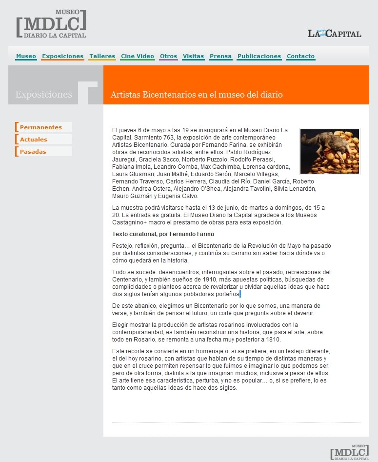 Hasta el 13 de junio habrá tiempo para visitar la exposición de arte contemporáneo en el Museo Diario La Capital, Sarmiento 763. La muestra es curada por Fernando Farina y se exhiben obras de reconocidos artistas, entre ellos: Pablo Rodríguez Jauregui, Graciela Sacco, Norberto Puzzolo, Rodolfo Perassi, Fabiana Imola, Leandro Comba, Max Cachimba, Lorena Cardona, Laura Glusman, Juan Mathé, Eduardo Serón, Marcelo Villegas, Fernando Traverso, Carlos Herrera, Claudia del Río, Daniel García, Roberto Echen, Andrea Ostera, Alejandro O’Shea, Alejandra Tavolini, Silvia Lenardón, Mauro Guzmán y Eugenia Calvo.